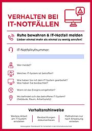 Ob Fehlfunktion oder Cyberangriff: Bei einem IT-Schaden ist der Stress meist sehr groß. Hilfe bietet hier die IT-Notfallkarte des Bundesamtes für Sicherheit in der Informationstechnik (BSI). Diese wurde tatsächlich analog zum bekannten Hinweisschild „Verhalten im Brandfall“ konzipiert und ist schon seit ein paar Jahren in Betrieben etabliert. Sie können sich die IT-Notfallkarte kostenfrei als PDF auf der BSI-Website herunterladen. Und Sie sollten sie an zentralen Orten bzw. in der Nähe der Rechner platzieren, damit die Teammitglieder sie im Fall der Fälle direkt im Blick haben. Auch ein Blick in weiteres Informationsmaterial des BSI lohnt sich, um sich auf solche Situationen vorzubereiten.